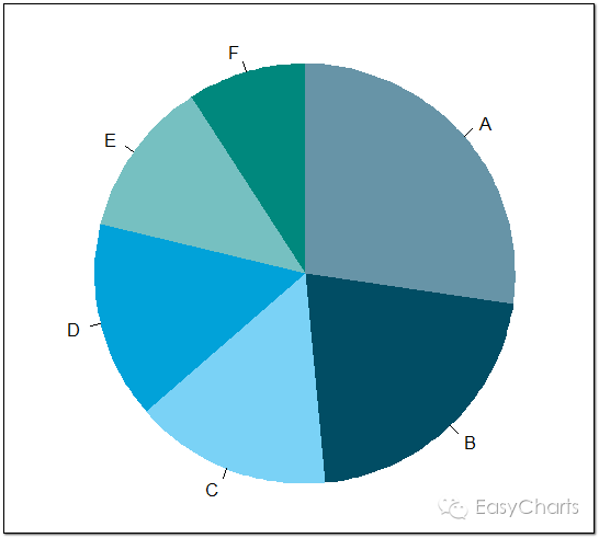 pie(sort(c,decreasing=T),labels=names(c),col=mycolor[c(3,5,5,6,7,9)],clockwise=T,radius=1,border=F)