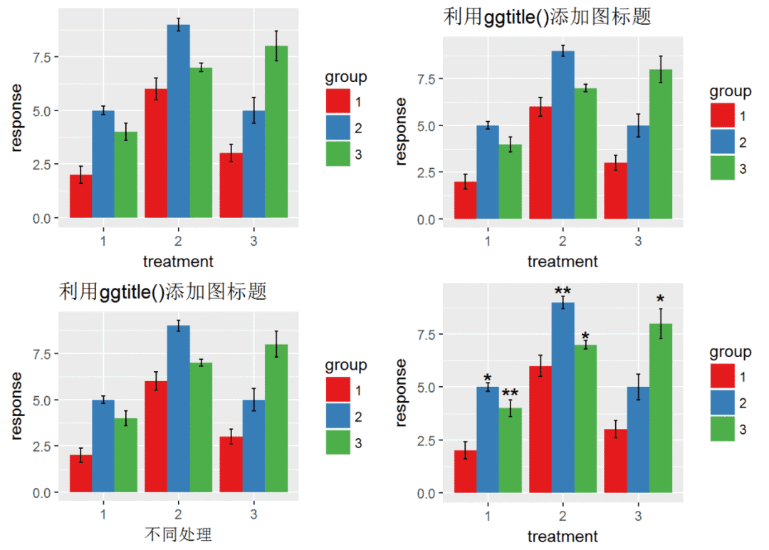 p2 <- p + ggtitle("利用ggtitle()添加图标题") + xlab("不同处理") + ylab("response")
