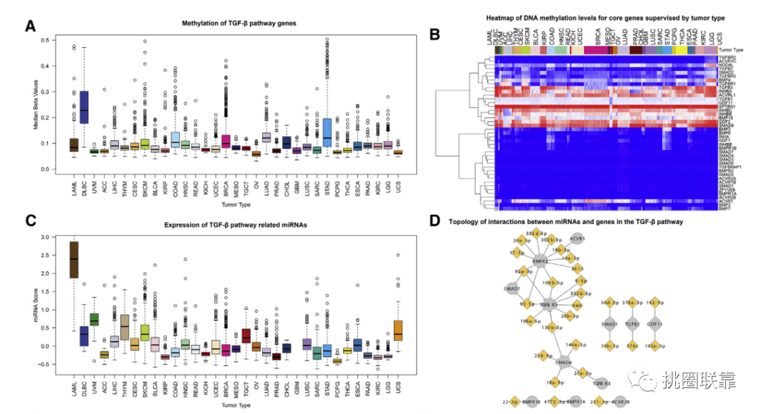 以上分析都是基于mRNA表达谱的,高分生新文章的另一大特点是多数据类型。为了探究TGF-β通路活性的调控,作者评估了DNA甲基化和miRNA表达与癌症的相关性。根据肿瘤类型分组的每个样本的41个基因的甲基化水平显示了高变异性。发现TGF-β途径活性评分最低的DLBCs的DNA甲基化评分中值和范围最高,而途径活性较低的LAML的DNA甲基化评分中值较低(Fig. 7A)。根据DNA甲基化水平聚类分析,表观遗传聚类分析将基因分为两大类:在任何癌症中几乎或没有发生DNA甲基化的基因,以及在部分或全部癌症中发生DNA甲基化的基因(Fig. 7B)。并选择了与转录丰度相关的前32个miRNA,在32种肿瘤类型中表现出可变表达(Fig. 7C);预测43个基因中有15个是至少1个miRNA的靶标;BMPR2、TGFBR2和SMAD4均被5个或更多的miRNA靶向(Fig. 7D)。