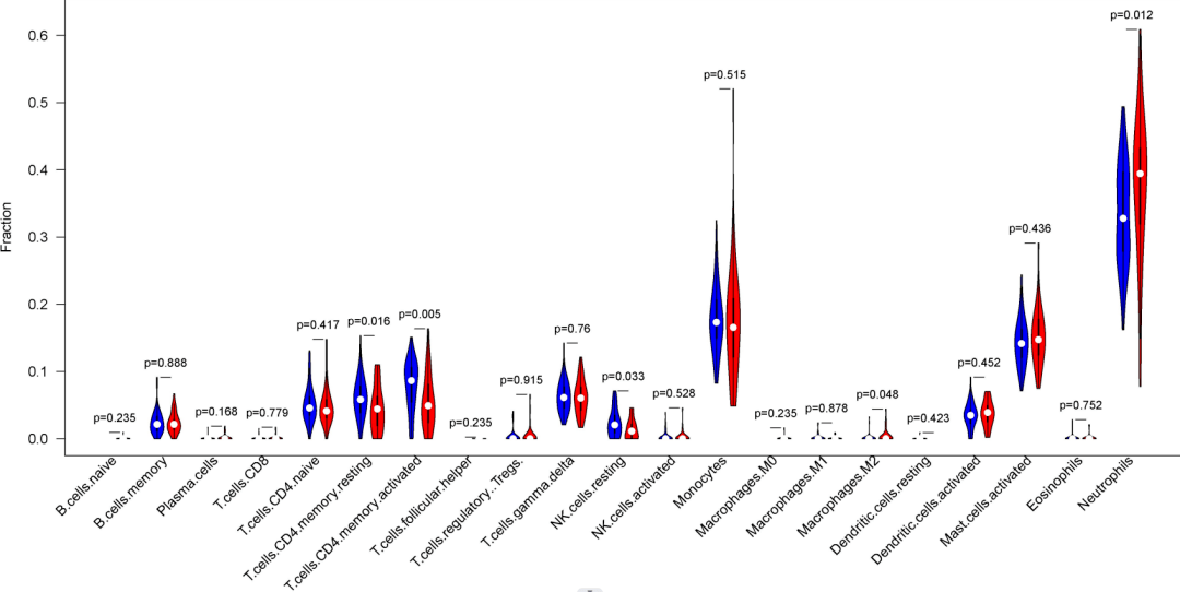 那么这个时候我们可以参考免疫浸润分析答案自然就呼之欲出了,也就是说我如果把参考基因集换成免疫相关基因,然后通过使用ssGSEA针对疾病组和对照组,那么我们就可以得到疾病组和对照组分别的免疫浸润情况,然后通过进行秩和检验,自然就可以得到下面这张在文献中经常出现的小提琴图: