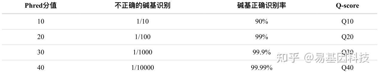 测序过程本身存在发⽣机器错误的可能性,测序错误率分布检查可以反映测序数据的质量,序列信息中每个碱基的测序质量值保存在FASTQ⽂件中。如果测序错误率⽤e表示,Illumina的碱基质量值⽤Q 表示,则有:Q =-10log10(e)。Illumina Casava 1.8版本碱基识别与Phred分值之间的简明对应关系⻅下表: