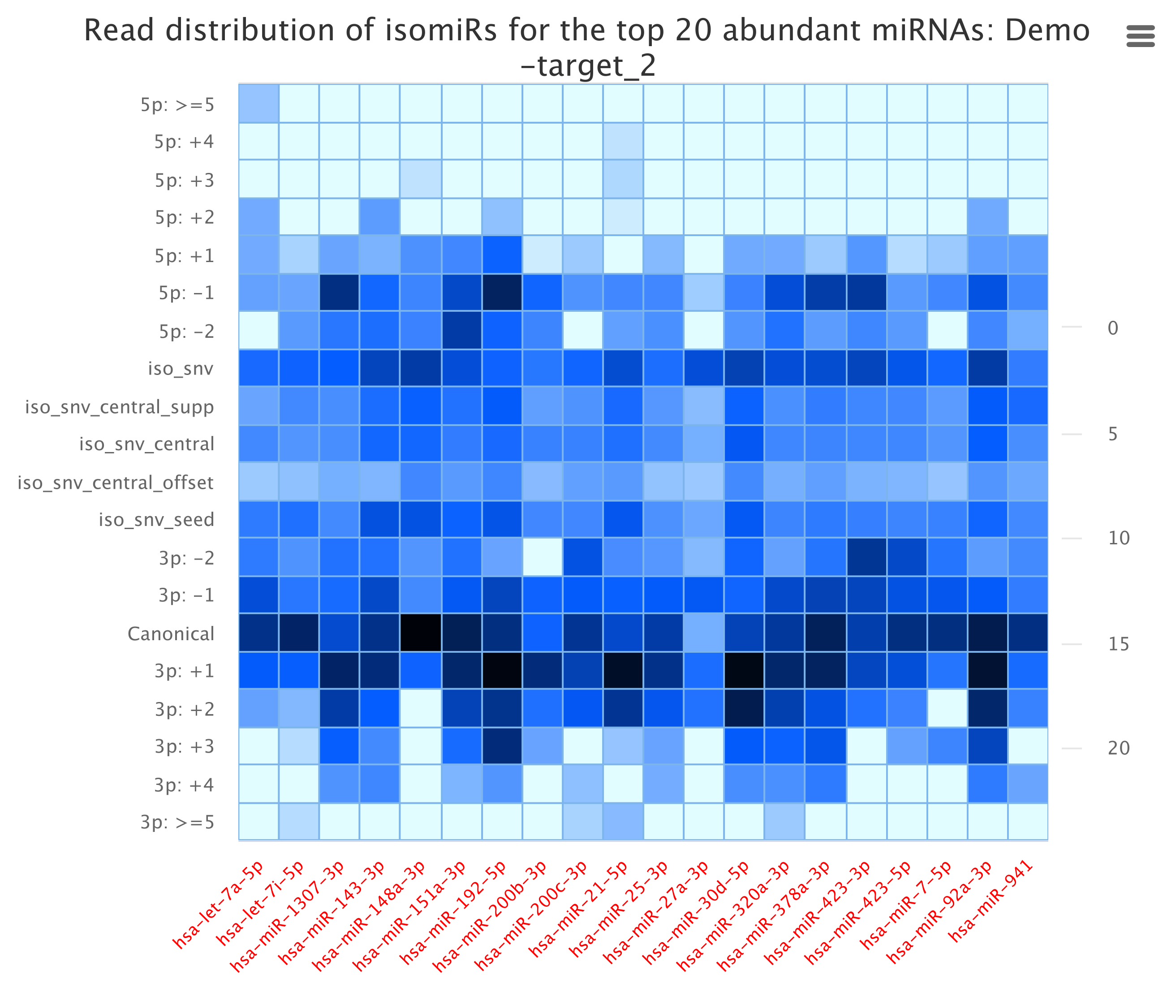 我们通过序列与miRbase比对的情况,将各个miRNA Reads进行isomiR识别,并同时汇总至miRNA reads 注释结果中,分类统计,并选取表达量较高的前20个mirna进行各类IsomiRs表达丰度统计。