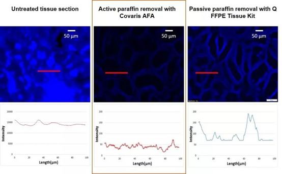为消除石蜡对DNA提取和PCR扩增的不良影响,必须在保证不增加外源性PCR抑制因子和尽量减少DNA额外损伤的前提下对组织进行彻底的脱蜡。在此过程中,先溶解石蜡,然后去除,暴露样品,用于后续裂解缓冲液和蛋白酶K(如果合适)的处理。多种溶剂适用于脱蜡,如二甲苯、庚烷和柠檬烯等。二甲苯脱蜡不仅容易造成核酸片段化和得率低,而且对人有毒害,切片越厚或存放时间越长,脱蜡效果越差。作为溶剂法的替代,石蜡也可通过加热与FFPE样品分离:熔化后,石蜡冷却,取决于其用量,石蜡粘在管壁上,或在样品上形成一个固体层。市面上主流试剂盒是采用无毒裂解液方法脱蜡,以及Covaris的超声乳化脱蜡,纳米级别的处理使得FFPE样品彻底脱蜡和水化。