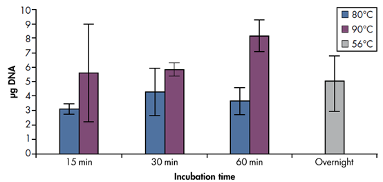 尽管过度加热会导致DNA降解,但QIAGEN的研究表明,在90°C孵育1小时可实现可分析基因组DNA的最佳回收。数据还显示,56°C的1小时孵育加上90°C的1小时孵育使蛋白酶K过夜孵育不再成为必需。
