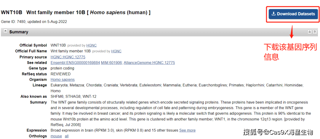 (图1) NCBI网站查询WNT10B基因信息
