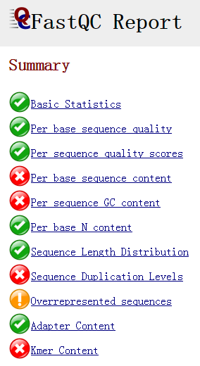7. 输出的压缩文件将是SRR3151766_1_fastqc.zip,解压后,查看html格式的结果报告,结果分为绿色的“PASS”,黄色的“WARN”和红色的“FALL”结果如下图: