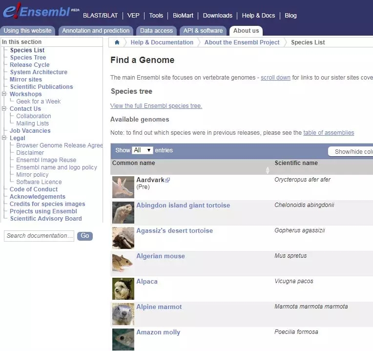 以动物的页面为例,人、小鼠和斑马鱼这类的常用模式物种,我们可以直接点进去看基因组信息。若ensembl数据库中有收录我们要查的物种基因组,点击view full list of all Ensembl species,我们可以在list中找到我们关注的物种,如果列表中没有、可直接在搜索框搜索(图1、图2)。很多物种拥有不止一个基因组版本,不同基因组版本可能来源于不同的基因组项目,或对应这不同的亚种,进入相应物种页面之后,我们可以进入到不同的基因组链接中进行查看,例如小鼠不同株系的细胞,也是需要在该位置点击株系列表浏览(图3)。