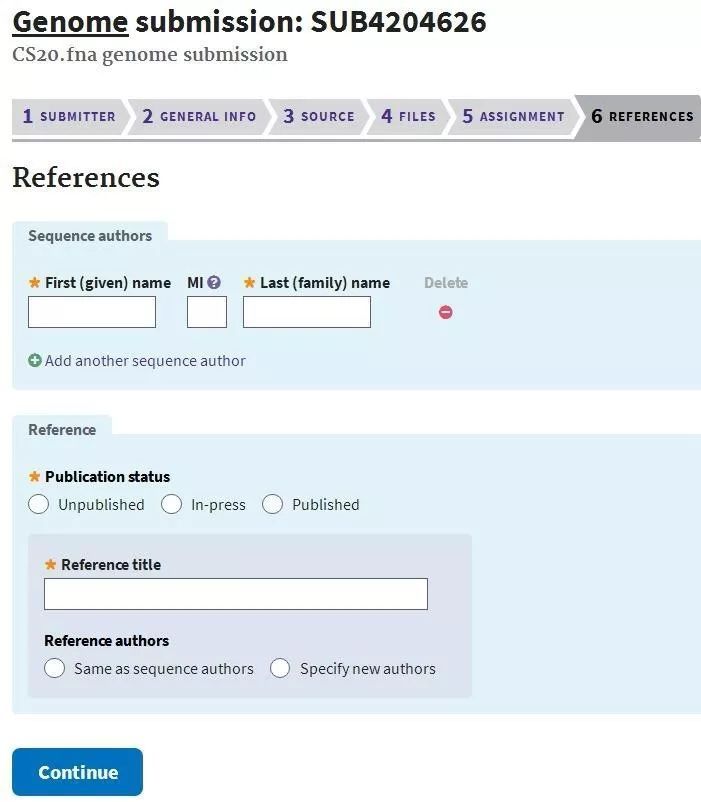 1.上传生成得到的*.sqn 文件(具体生成步骤详见最后一部分利用 tbl2asn 软件生成符合 NCBI 上传规则的*.sqn 文件)或者 FASTA 文件,网址如下:https://submit.ncbi.nlm.nih.gov/subs/wgs/