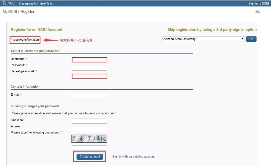 1.在 NCBI 主页右上角(https://www.ncbi.nlm.nih.gov/)My NCBI 登录系统中创建新的账号(已有就不需要),点击 Register for an account 创建账号: