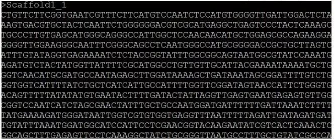 2.准备基因组文件,要求基因组序列文件,无 gap,即序列中不含 N,每个文件不超过 10,000 条序列。 格式:该文件为标准的 fasta 格式,第一行是描述信息,以“>”开头;第二行起始序列信息,每行长度不 超过 80 个字符。如下图所示: