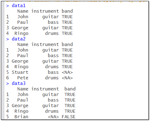 y<-data.frame(name=c("John","Paul","George","Ringo","Brian"),band=c("TRUE","TRUE","TRUE","TRUE","FALSE"))