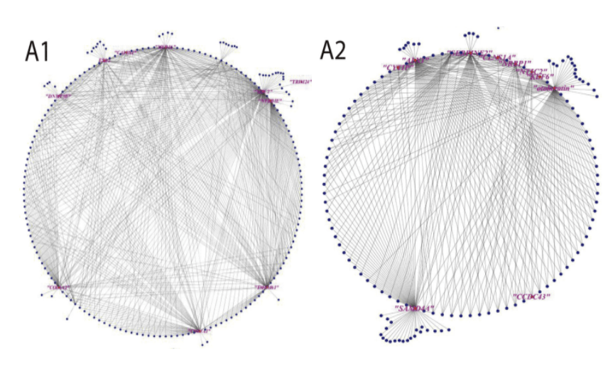 A1为天蓝色模块基因的网络描述,A2为淡刚蓝模块基因的网络描述,其中红色表示关键基因。