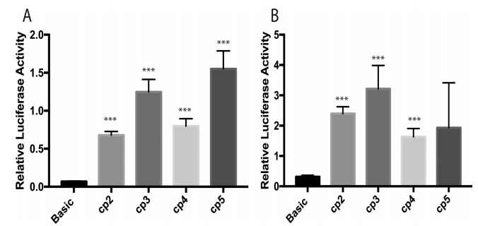 构建CYP19A1启动子片段与荧光素酶融合表达载体,利用荧光素酶报告基因在293T(图7-A)和DF-1(图7-B)细胞中检测CYP19A1启动子片段(cp2-cp5)活性,发现其均具有启动子活性。