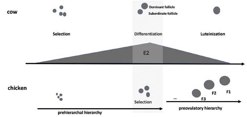 3 “卵泡选择”一词用于哺乳动物和鸟类,这表明在不同物种中有相似的过程。结果表明,其发生在牛和鸡的不同阶段。如图9所示,牛卵泡选择后的分化阶段实际上与鸡的小黄卵泡选择阶段相当。