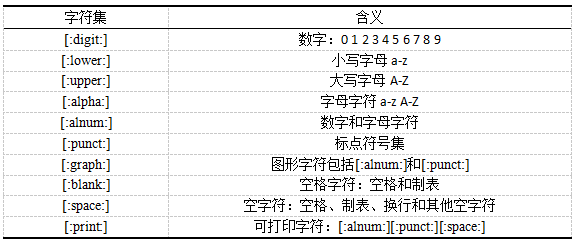 对于特定的字符我们可以手动指定,比如[a-z A-Z]表示a-z和A-Z之间的所有字母,但R预先定义了一些字符集方便大家调用,如下表所示。