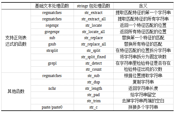 R中基础文本处理函数和stringr包文本处理函数对于正则表达式的支持情况如下表所示: