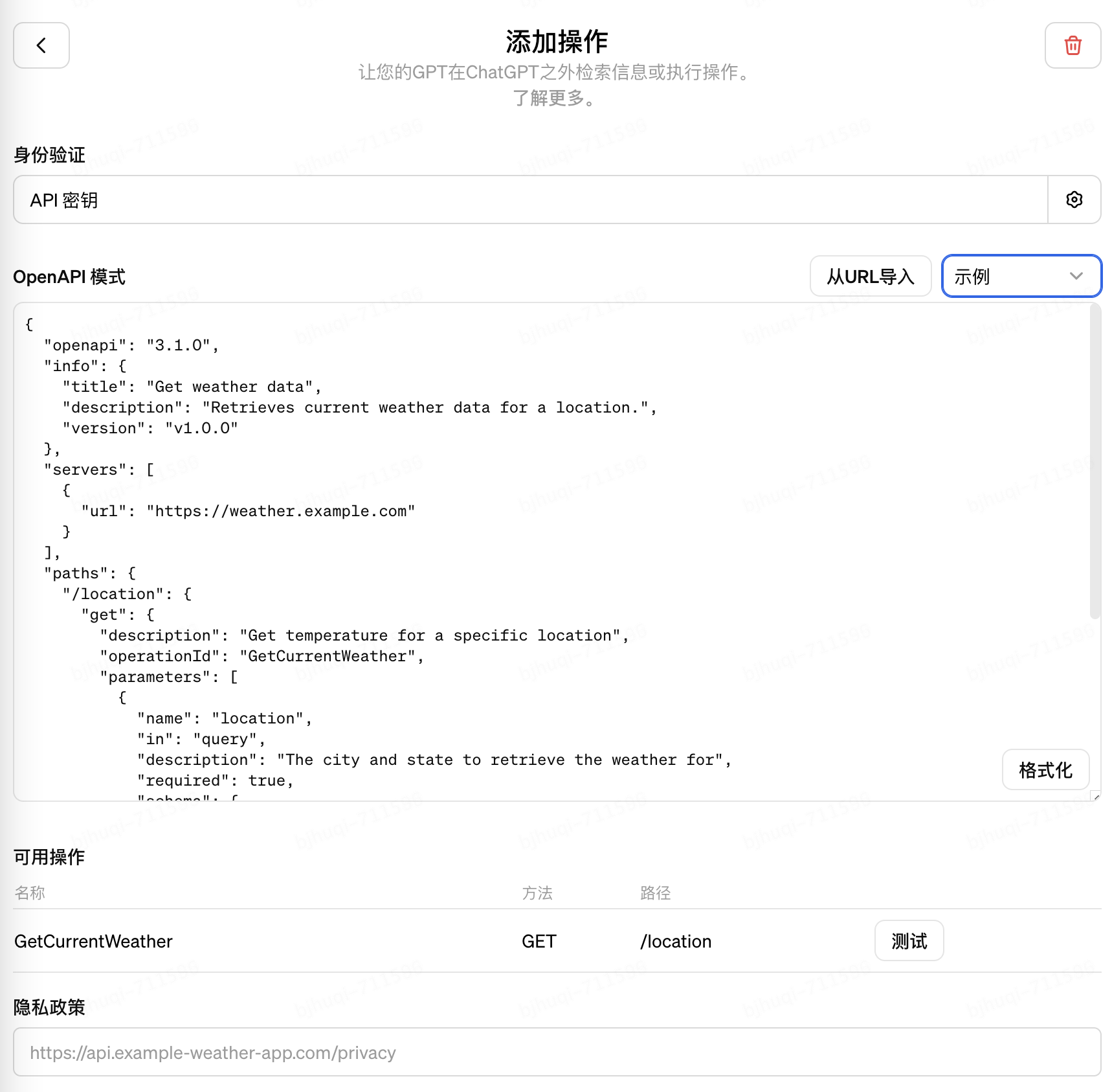 5. 更重要的是,可以通过添加“Actions”的方式,接入你的API服务给到大模型调用,API通过遵循OpenAPI3的规范进行自描述。大模型可以根据API的功能描述以及输入输出定义,结合用户会话上下文进行智能的调用,获取你的私域数据进行推理,这可以理解是一种对LLM的“动态”增强。如下图:
