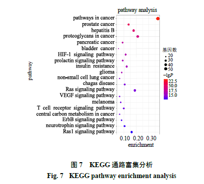 KEGG通路富集分析结果如图7所示,具有显著意义(P<0.05)的通路共139条,主要与Ras信号通路、胰岛素抵抗信号通路、低氧诱导因子(hypoxia-inducible factor,HIF-1)信号通路、催乳素信号通路、血管内皮生长因子(vascular endothelial growth factor,VEGF)信号通路和T细胞受体信号通路等方面有关。