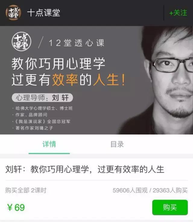 2016年也被称为内容付费的元年,它被看做是流量变现的又一盈利渠道。从半年前开始策划,线上教育板块“十点课堂”目前涵盖了10种付费课程,涉及到情感、心理、美学、职场、生活五个领域,已经做到5万付费用户。仅上线一个月,刘轩的《教你巧用心理学,过有效率的人生》课程就销售了两万五千份,整体销量有望达到10万量级,那就意味着单门课程可以做到千万营收。