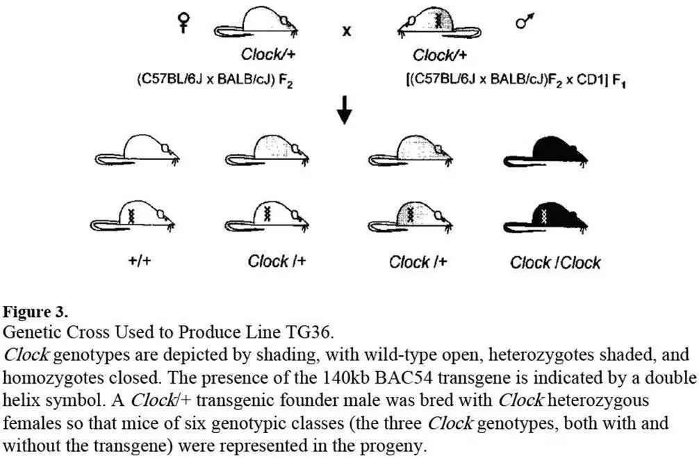 通过化学诱变的方法得到昼夜节律时间异常的半突变小鼠,通过该类小鼠交配获得突变纯合体。该突变纯合体完全失去昼夜节律。通过碱基序列比对,最终确定该基因的位置,并将其命名为Clock基因。