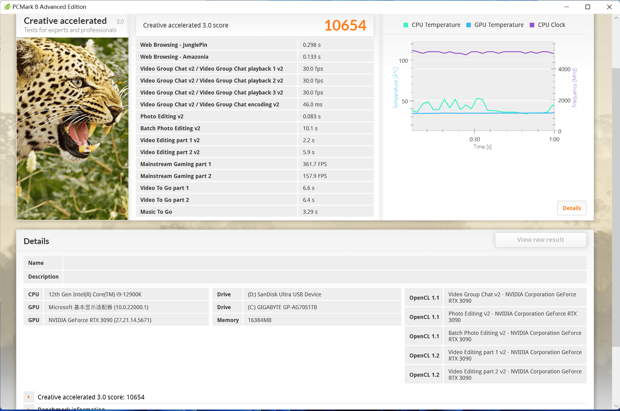 有意思的是,pcmark10不能在win11下面运行,反而pcmark8一路通行。十二代酷睿i9 12900k+RTX3090的顶级配置,在pcmark8的跑分是10654(创作者性能测试)。虽然是正版软件,一切硬件都识别正常,考虑到软件内核估计还是比较老,这个跑分仅供参考。