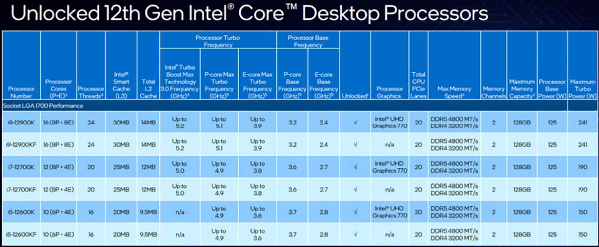 其中旗舰型号i9-12900K/KF具备8个性能核心+8个效能核心,拥有16核24线程,默频为3.2GHz,最高睿频可达5.2Ghz,全核睿频可达到5.0Ghz。配有30MB三级缓存,支持AVX,AVX2等指令集,TDP设计为125W,传输带宽为64-Bit,内置UHD770核心显卡,支持DDR4-3200和DDR5-4800两种规格,处理器支持PCIe 5.0。