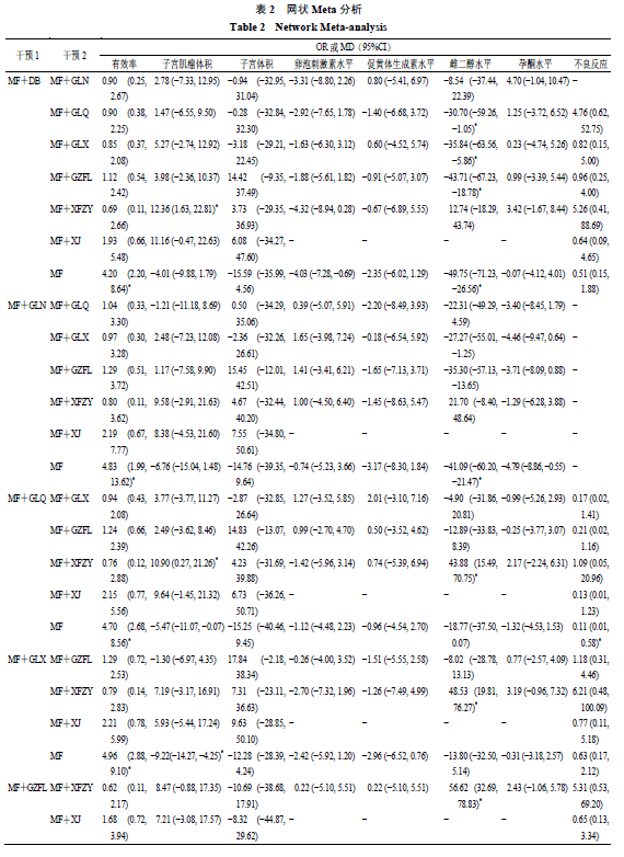 2.5.2子宫肌瘤体积共有40篇[5-19,21-30,32-34,36-47]文献报道了子宫肌瘤体积,以MD为效应量,宫瘤消胶囊+米非司酮[MD=−9.22,95%CI (−14.27,−4.25)]、桂枝茯苓丸(胶囊)+米非司酮[MD=−7.95,95%CI (−10.76,−5.27)]、血府逐瘀胶囊(口服液)+米非司酮[MD=−16.40,95%CI (−24.96,−7.45)]、小金丸(胶囊)+米非司酮[MD=−15.21,95%CI (−25.30,−5.18)] 的子宫肌瘤体积均小于单用米非司酮,差异具有统计学意义(P<0.05);丹鳖胶囊+米非司酮[MD=12.36,95%CI (1.63,22.81)]、宫瘤清胶囊+米非司酮[MD=10.90,95%CI (0.27,21.26)] 的子宫肌瘤体积均大于血府逐瘀胶囊(口服液)+米非司酮,差异具有统计学意义(P<0.05);其余两两比较差异无统计学意义。见表2。