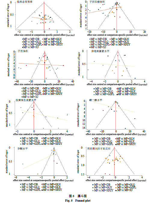综上所述,通过对中成药联合米非司酮治疗子宫肌瘤的RCT进行网状Meta分析,旨在为临床的合理用药提供证据,临床可通过患者目前的首要需求给予个性化治疗方案。但本研究所纳入的文献存在发表偏倚,今后仍需更大样本量、更严谨研究方案的RCT来进一步证明,以便于提供更加可靠的循证医学证据。
