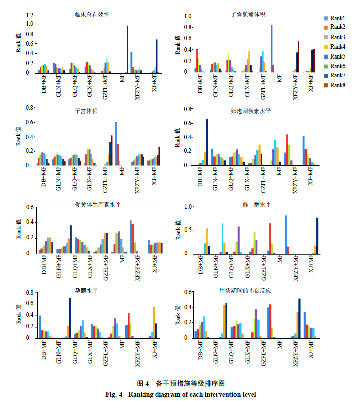 子宫体积结果等级排序图如图4所示,共包含8种 干预措施,以Rank 8数值越大越好,依次为桂枝茯苓丸(胶囊)+米非司酮(0.42)>小金丸(胶囊)+米非司酮(0.26)>血府逐瘀胶囊(口服液) +米非司酮(0.13)>宫瘤宁胶囊+米非司酮(0.07)=宫瘤清胶囊+米非司酮(0.07)>丹鳖胶囊+米非司酮(0.04)>宫瘤消胶囊+米非司酮(0.01)>米非司酮(0.00)。