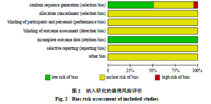 本研究纳入的文献中,说明具体随机方法的文献共有24篇,其中使用随机数字表法的文献共22篇[5,9-12,15,19,20,22,23,25,26,28,30-32,41-43,45-47],评为低风险;1篇[34]使用抽签法;1篇[35]根据入院顺序进行分组,评为“高风险”。19篇[6-8,13,14,16-18,21,24,27,29,33,36-40,44]文献只将分组方式描述为随机,并未详细说明具体方式,评为“不清楚”。纳入文献均未说明分配隐藏和盲法,评为“不清楚”。不完整数据结局方面均为“低风险”。选择性报告方面,由于纳入的文献具体方案无法获取,因此偏倚风险无法评估。其他偏倚均“不清楚”,见图2。