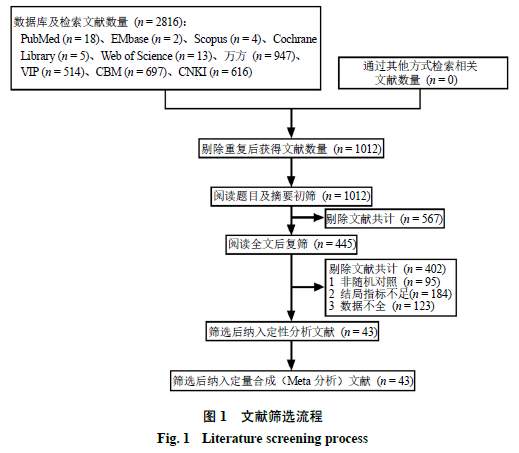 使用EndNote X9软件对文献进行管理。根据文献检索策略初步筛选文献2816篇,剔除重复后获得文献1012篇,随后阅读题目和摘要后获得文献445篇,最后阅读全文后共纳入定性和定量文献43篇,文献筛选流程见图1。