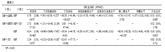 而针对子宫体积方面,以桂枝茯苓丸(胶囊)联合米非司酮的疗效最佳,该复方中桃仁和赤芍有抗肿瘤的作用[52],其组方可改善子宫肌瘤大鼠肌瘤组织炎性细胞浸润程度、平滑肌增生情况、平滑肌细胞内线粒体和粗面内质网异常形态改变,通过改善子宫肌瘤体积而缩小子宫体积[53]。