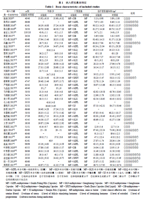1.1.4结局指标①临床总有效率;②子宫肌瘤体积;③子宫体积;④卵泡刺激素水平;⑤促黄体生成素水平;⑥雌二醇水平;⑦孕酮水平;⑧用药期间的不良反应。