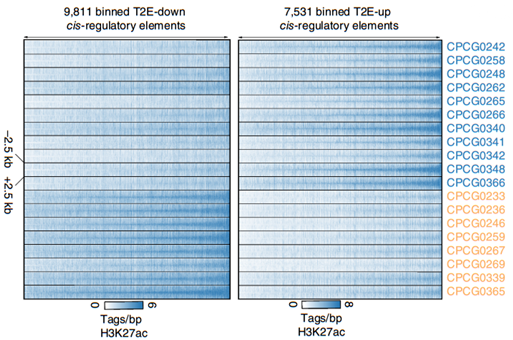 两组样本(蓝色和橙色)组蛋白修饰H3K27ac分布,同一基因(位点)在一组中修饰程度较高,而在另一组中修饰程度较低。(图片来源:TMPRSS2–ERG fusion co-opts master transcription factors and activates NOTCH signaling in primary prostate cancer)