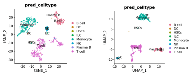 t-SNE/UMAP图:标准化过滤后的数据,使用降维(PCA)和聚类进行细胞分型,根据聚类结果,采用t-SNE/UMAP降维算法,将细胞的分布进行展示,并使用Single Cell Identificator Based on E-test (SciBet)和参考数据集对细胞类型进行注释(如下图)。